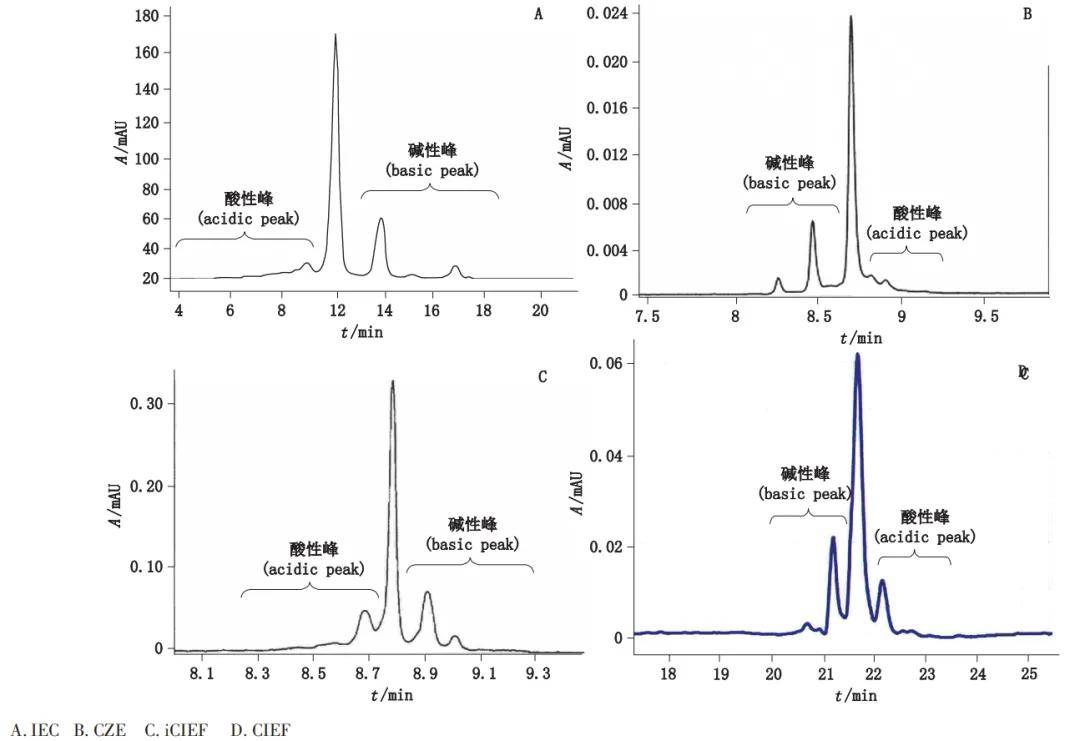 如下图例为抗 TNFα 全人源单克隆抗体呈典型的单抗电荷异质性分布,表现为主峰及其左右两侧的酸、碱性峰,由于分离机制的差异,酸、碱性峰的出峰顺序有所不同,在 IEC 和iCIEF 方法下,出峰顺序依次为酸性峰、主峰和碱性峰;CZE和CIEF方法下,出峰顺序依次为碱性峰、主峰和酸性峰。